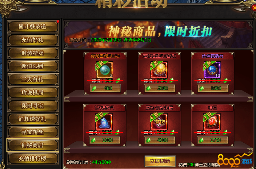 活动说明:神秘商店限时来袭,超低折扣,限时购买。同时可以通过刷新按钮,花费200神玉进行刷新