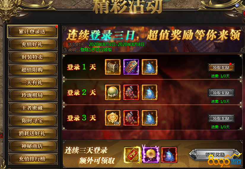 活动说:每日充值可以领取充值宝箱,连续三天充值更有额外极品奖励