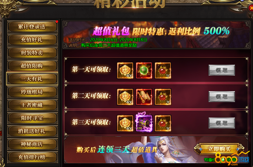 活动说明:一次购买,未来三天每日皆可领取极品奖励,助力成神