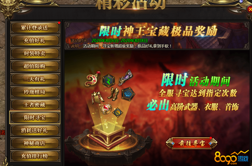 活动说明:神王宝藏限时发放极品装备、神器等,全服寻宝达到一定次数可获得保底奖励