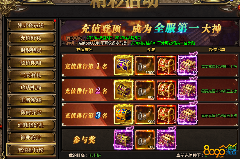 活动说明:名动本服,充值达到100000神玉即可参与排行,前三名均可获得极品自选宝箱。充值达到50000神玉即可获得参与奖。奖励会在活动结束后通过邮件发放
