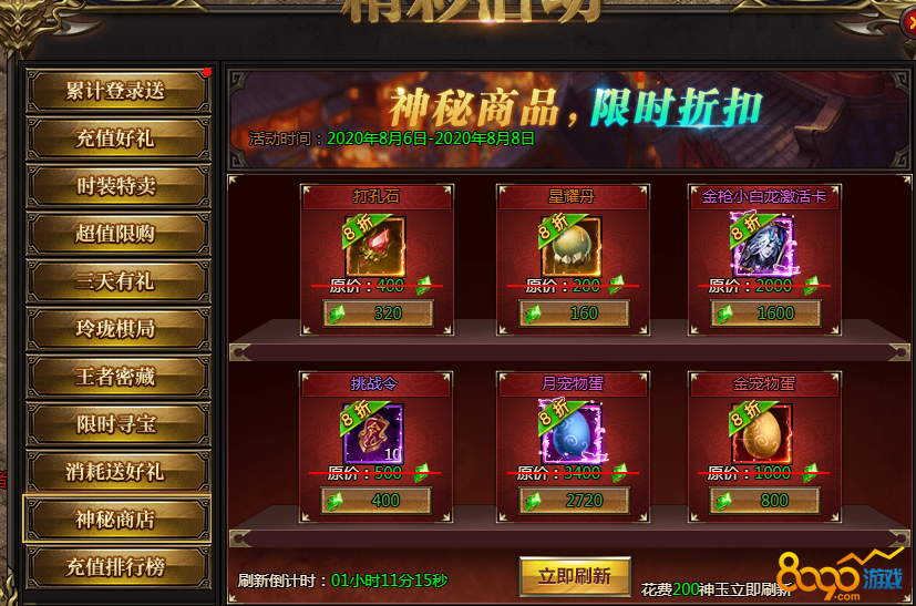 活动说明:神秘商店限时来袭,超低折扣,限时购买。同时可以通过刷新按钮,花费200神玉进行刷新