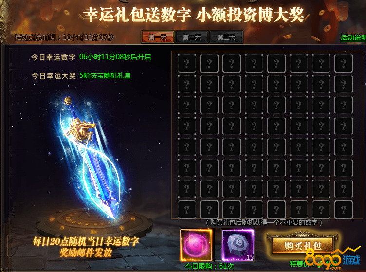 活动说明:购买礼包获得幸运数字,即可参与超级大奖