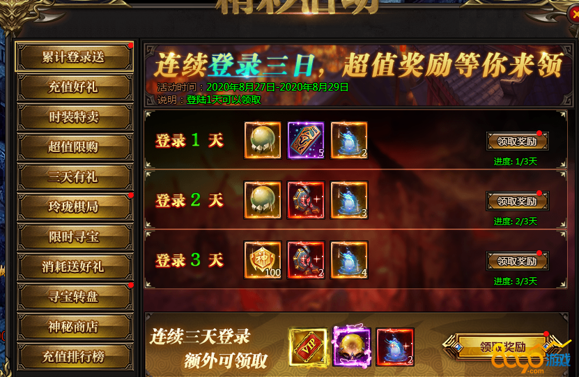 活动说明:活动期间,每天登陆即可领取奖励,连续三天更有额外奖励