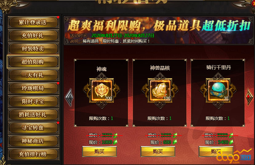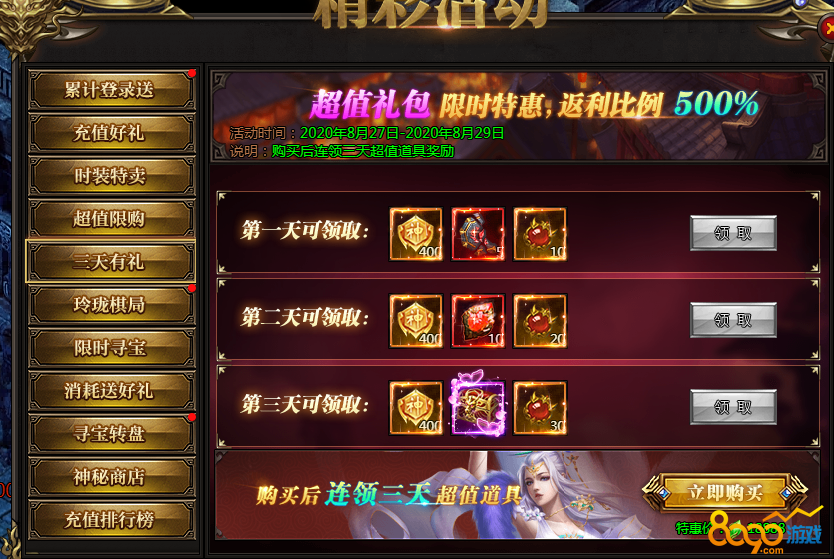 活动说明:一次购买,未来三天每日皆可领取极品奖励,助力成神