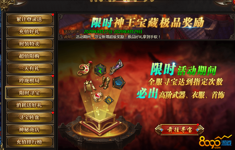 活动说明:神王宝藏限时发放极品装备、神器等,全服寻宝达到一定次数可获得保底奖励