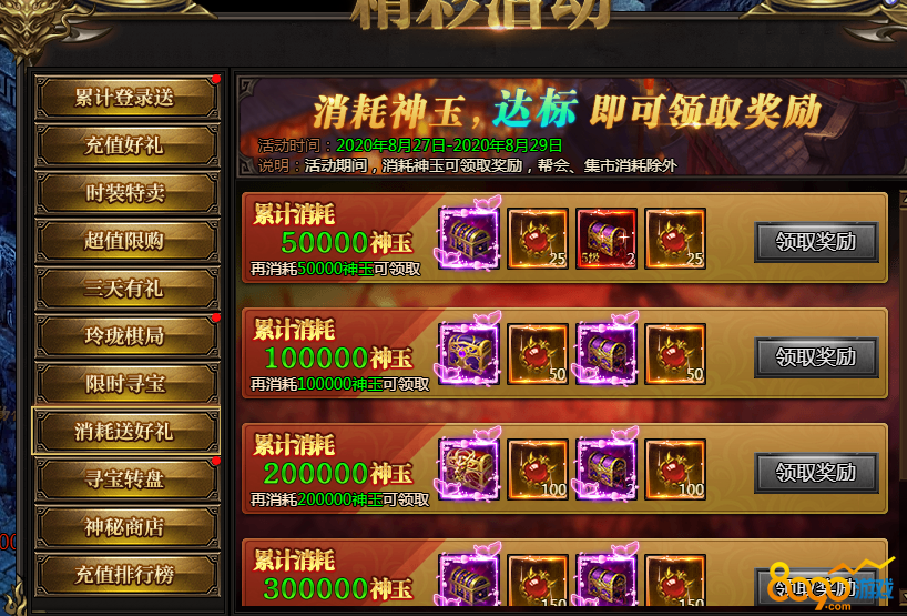 活动说明:活动期间,消耗神玉可以领取奖励,帮会、集市消耗除外