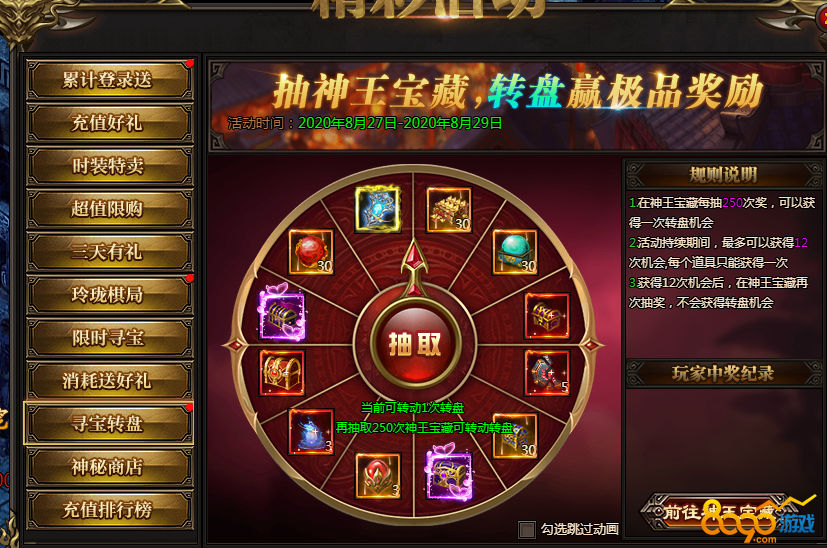 活动说明:每抽取250次神王宝藏可获得转盘机会,转动转盘获得极品保底奖励