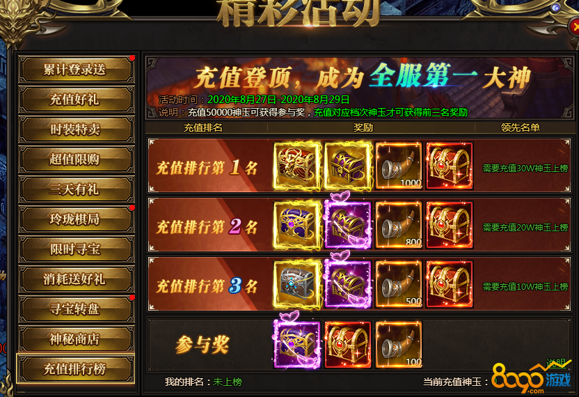 活动说明:名动本服,充值达到100000神玉即可参与排行,前三名均可获得极品自选宝箱。充值达到50000神玉即可获得参与奖。奖励会在活动结束后通过邮件发放