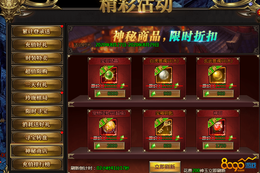 活动说明:神秘商店限时来袭,超低折扣,限时购买。同时可以通过刷新按钮,花费200神玉进行刷新