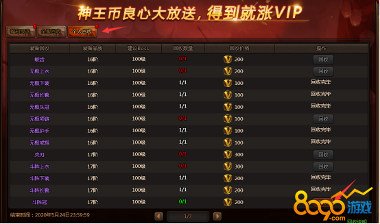 该游戏的VIP升级条件是达到系统设定的神王币值即可升级VIP,神王币来源有:各种任务,打怪,回收,充值,以及直接购买。