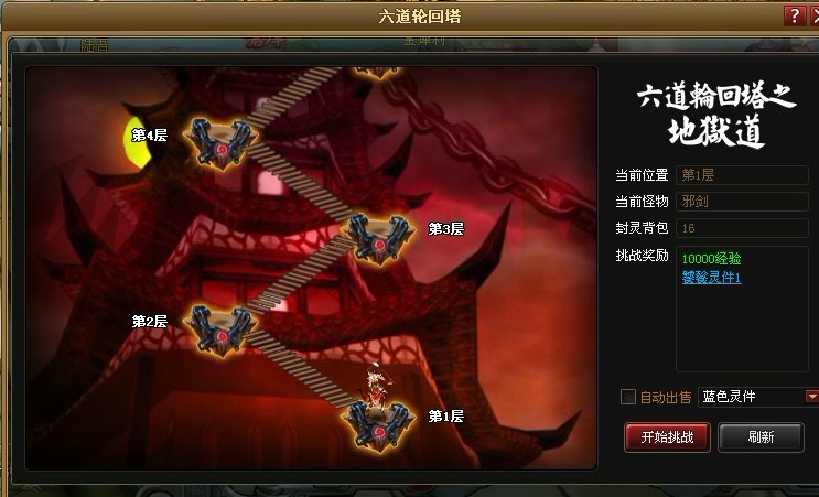 50级之后可以参加六道轮回塔哦,每打通一层有几率获得封灵配件,和10000经验。第一次打的时候,需要手动,当你通过25层的时候,才可以进入下一道。每道可以挑战6次,每道第一次重置是免费的,而且可以自动爬塔,既省时间,又省药钱。第2次-第6次都是需要元宝消费才可以重置。封灵配件可以为玩家的武器封灵,将灵件放到特定的位置上,进行洗练,可洗练出强力的属性为装备封灵增加哦。