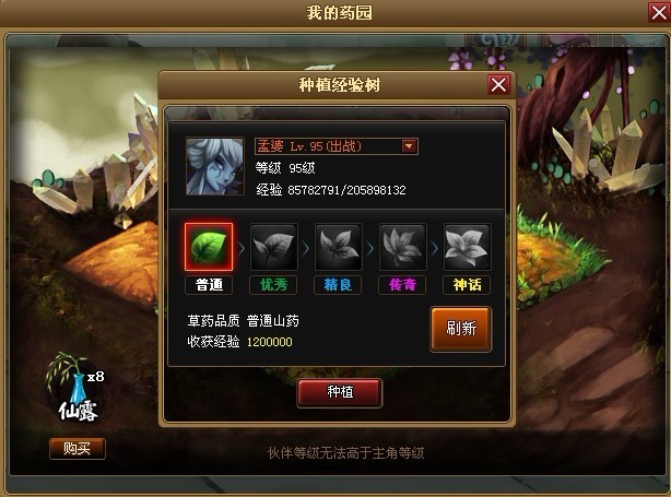开了地之后,一开始我们只能够种经验树,经验树也帮助我们伙伴升级,当然如果一直保持伙伴和主角同样等级那么经验树是种不了的。后期更换伙伴的时候种经验树很重要,想要伙伴的等级快速上来就必须种品质好一点的经验树了。