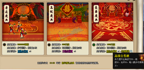 结婚之前首先要求婚,虽然要花元宝购买戒指,但也能获得相应的声望,而对方同意结婚后,还要选择结婚庆典的档次,档次越高消费也就越大。当然选择结婚庆典也是有奖励的,而豪华庆典将会有花车巡游、发红包三次,并且会赠送高级合卺酒以及结婚套装。