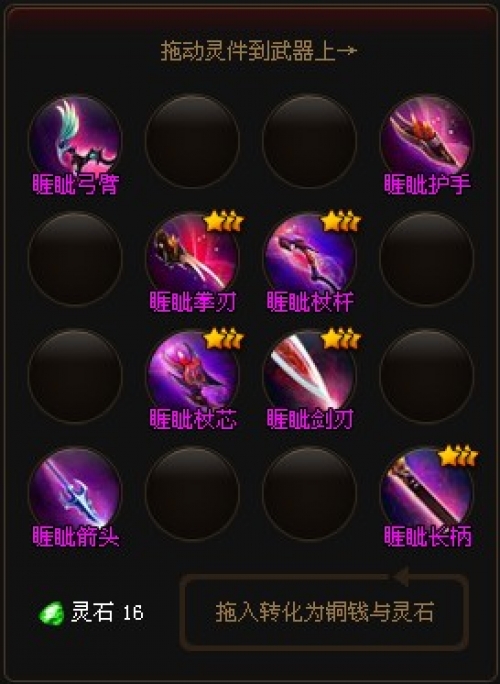 由于在轮回塔中吸取的灵力不同,配件分为蓝色、紫色和金色三个品阶,蓝色最低,金色最强,金色配件只有在阿修罗道和天道才有希望得到。所以现阶段紫色配件最佳。每个配件通过激活可随机获得3个属性,攻击防御暴击韧性命中生命中随机3个。如果对属性不满意还可以花费灵石进行洗练,当3件配件都洗练出钟意属性时,一件霸道的仙兵也就诞生了。