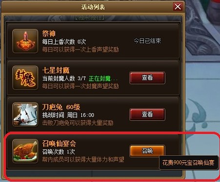 想要体验帮派仙宴里的美食,那你首先就要加入帮派,唯有加入帮派才算是拿到了仙宴邀请卡。进入帮派后,打开帮派活动界面就能开启仙宴活动,开启仙宴没有任何时间限制,只要玩家需要随时都可开启。玩家每天可以召唤1次仙宴,花费900元宝就能开启仙宴,开启后你也会获得1000声望奖励。开启一次仙宴可保持3个小时,在这3小时内,你所在帮派的玩家都可以参与仙宴活动。