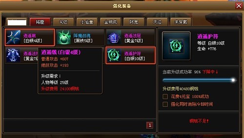 装备离不开强化,强化有青铜、黑铁、白银、黄金、暗金和红玉六种,分别由低到高级排列。玩家没进行一次强化就可以升级一次,每一个等级有10级强化,强化完成顺利进入下一等级。当你要合成紫色装备时,切忌先将蓝色的装备尽可能的强化到最高,因为紫装强化的费用比蓝装高很多。