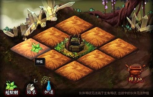 在药园中可以选择种植经验树或财富树二种,点击经验树后选取一块土地种植后会显示伙伴版面,选取需要训练的伙伴进行种植即可。