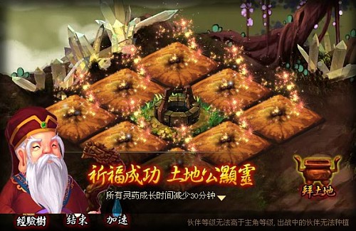 种植好后可以通过拜土地使种植时间减少,祈福成功的话灵药的成长时间会随机减少。当然啦,世界上那么多人拜土地公公,他老人家是有多忙是有目共睹的,所以有时候难免会跑去休息休息的,在土地公公休息时,如花姐儿会临时掌管一下祈福业务。也不知道是不是游戏模式也喜爱以貌为贵,导致如花出动必定祈福失败的窘况,运气啊Rp啊,请乃们大发慈悲眷顾一下8090网页游戏《神仙道》中的侠士们吧!