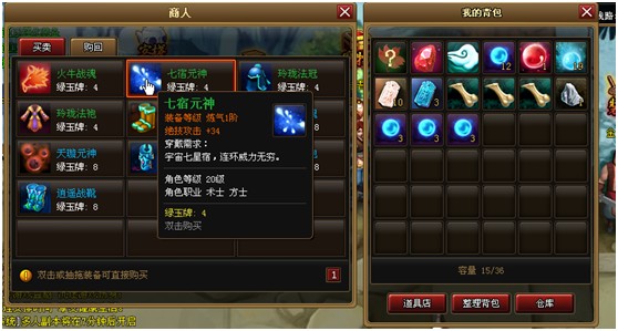 在城市的大街小巷分布着大大小小的店铺和商人,比如,玩家可以在道具商人处购买气血包、坐骑、护符等游戏物品;可以在装备商人处购买到游戏内的装备;可以在宝物商人处出售各种高级装备,亦或者找到仓库管理员进行对话,让他为你保管你的财物。