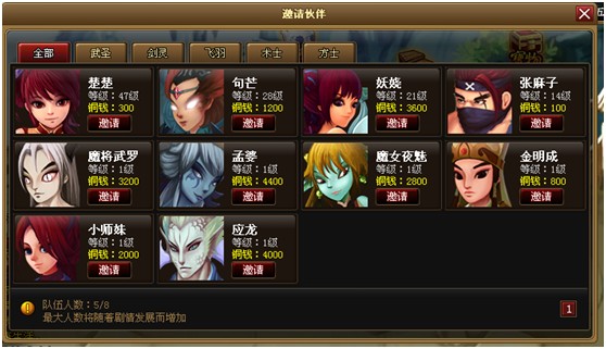 玩家进入邀请伙伴界面后,就可以邀请各有特色的伙伴协助你出战。伙伴职业分为剑灵、飞羽、武圣、方士、术士、将星几大职业,每个伙伴的绝招各自不同,属性也各自不相同。将鼠标移动到图标上,即可查询伙伴信息,伙伴招募上限人数随着剧情发展而增加。当邀请成功后会提示邀请伙伴成功。