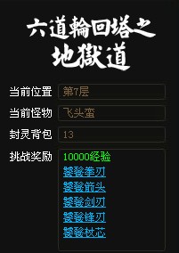 | 地狱道 | 怪物布阵 | 名称 | 怪物等级 | 血量 | BOSS | 等级 | 血量 | 位置 | 挑战奖励 |