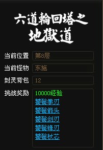 | 地狱道 | 怪物布阵 | 名称 | 怪物等级 | 血量 | BOSS | 等级 | 血量 | 位置 | 挑战奖励 |