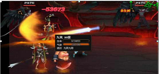 绝技一出,就是暴击秒杀,大家可以看下第3组图片,右手边剑灵主将放绝技如果萨菲罗斯不闪避了估计也是被秒杀的下场,从第一组图片看出,九凤3万4的血量,杀生剑打出5万3的伤害,如果换成孟婆的话,就孟婆那防御、那血量加成,估计要秒杀2个孟婆了。