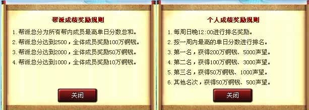 帮派总成绩:这点说明,必须要到2500点,每个人可以得到100万铜钱,100万铜钱不是小数字了,大家别忽略。