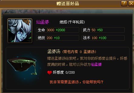 在喜好品兑换好以后,将需要升级的伙伴添加到阵型之中,然后从神仙道百炼壶中点击相应的喜好品即可增加与其的喜好度,一个喜好品增加的范围是3-5点,当玩家与伙伴的喜好度达到最大时,伙伴会进化成紫色,并在名称前面加上“仙”字前缀。目前可赠送的喜好品的伙伴有聂小倩、杨戬、铁扇公主、孟婆、刑天。如果你不知道伙伴进阶后有什么用,那让我们一起进入神仙道百炼壶的壶中界看一看这几位伙伴进阶后的属性吧。