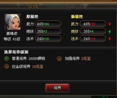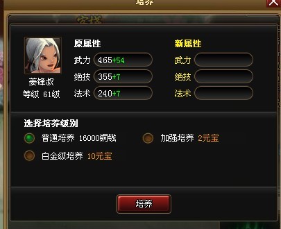 所以大家到50以后一定要把主角丹药吃满,其他伙伴可以只吃4级和5级丹,到60有了葫芦再补低级丹药。属性的提升除了吃丹药以外还一个非常重要的来源,那就是培养,我的悲剧主要来自于这方面。因为我只在20级之前培养过伙伴,之后就再没培养过了,我在论坛上看帖才发现,50级以后已经可以用铜板把单项属性培养到100+了,而我的主角才只是培养到武力加54.现在我等级超过60,培养一次需要1万6千铜板,我真是想死的心都有了。我写这篇攻略也有个目的就是赚点元宝培养主角。