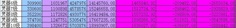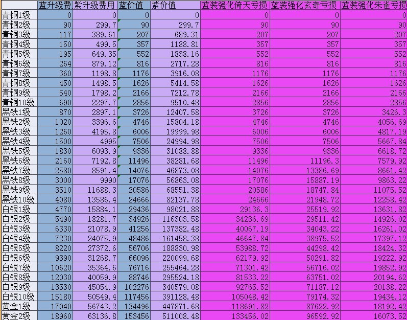 3、亏钱算法为当前蓝装价值-从青铜强化到对应级别的紫装价值。如:灵器四级的蓝装合成为暗金十级的玄奇,降了15级,这时灵器四级的蓝装价值3647076,而玄奇从青铜升到暗金十级需要3707209.08,这样3647076-3707209.08=-60133.08。就是说赚了6W多元。