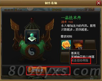 进入炼制小页面后,需要材料框里则是需要的材料和数量。当材料齐全数量充足时,点击【制作】就可以完成了。如果材料不全或数量不够也不用着急,游戏嘛元宝虽然不是万能但也很有用的,花费少量元宝就可以立即合成了。
