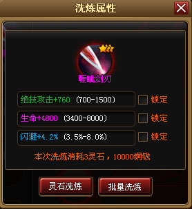 洗练增加了消耗灵石抵消元宝、洗练一条属性需要消耗1个灵石,2条属性2个灵石,3条属性3个灵石,洗练消耗灵石只根据属性数目,无视灵件品质。