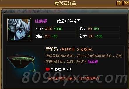 在喜好品兑换好以后,将需要升级的伙伴添加到阵型之中,然后从神仙道百炼壶中点击相应的喜好品即可增加与其的喜好度,一个喜好品增加的范围是3-5点,当玩家与伙伴的喜好度达到最大时,伙伴会进化成紫色,并在名称前面加上“仙”字前缀。目前可赠送的喜好品的伙伴有聂小倩、杨戬、铁扇公主、孟婆、刑天。如果你不知道伙伴进阶后有什么用,那让我们一起进入神仙道百炼壶的壶中界看一看这几位伙伴进阶后的属性吧。