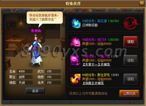 搜索“8090网页游戏” 在大话神仙游戏中,有个酒剑仙,这个闲人在20级完成任务时将会获得梨花酒,40级完成任务时,将会获得烧刀子,50级任务,一滴入魂,声望1000,经验60000.我们简单看下这个特殊伙伴的技能属性。