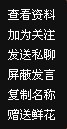 查看资料,加为关注,发送私聊,屏蔽发言,复制名称,赠送鲜花。