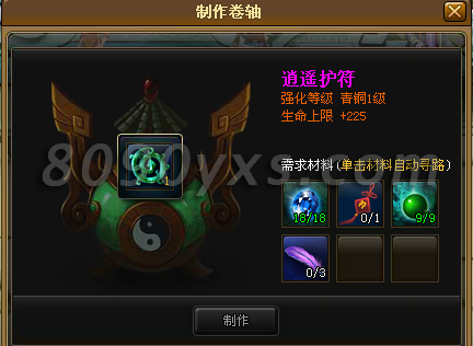 可制作物品:逍遥法冠,逍遥法袍,逍遥战戟,逍遥护符,三品绝技丹,三品法术丹。