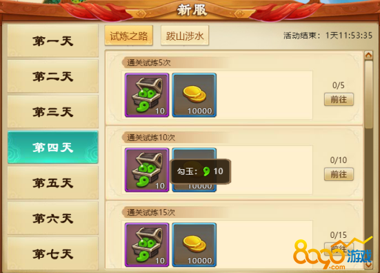 d) 第四天活动:活动期间通关试炼,渡劫玩法达到一定次数即可获得大量勾玉