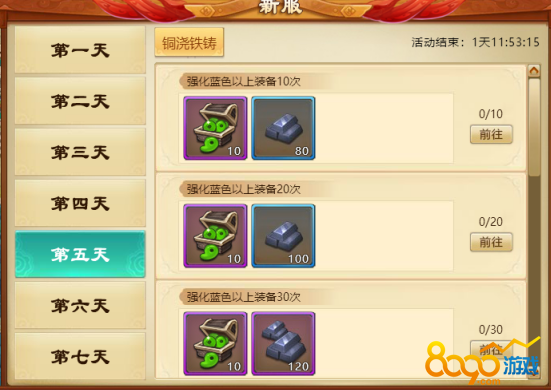 e) 第五天活动:活动期间,装备强化次数达到指定要求,即可获得大量玄铁