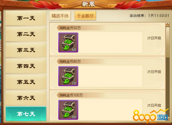 g) 第七天活动:活动期间,升级技能达到一定次数/累计消耗一定金币即可获得大量勾玉奖励