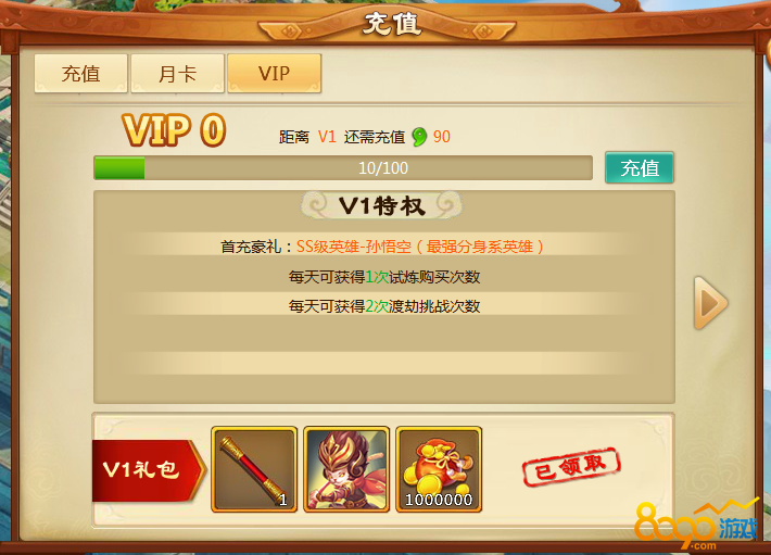 充值10元即可成为VIP,SS级英雄-孙悟空为你助阵杀敌。