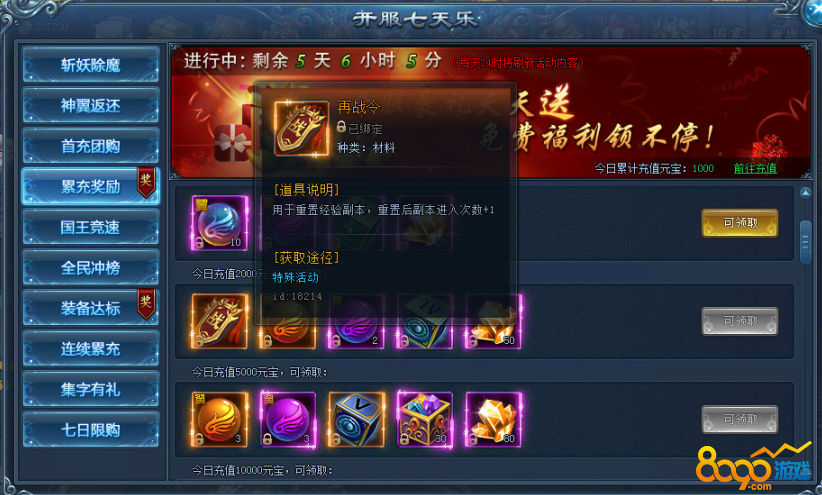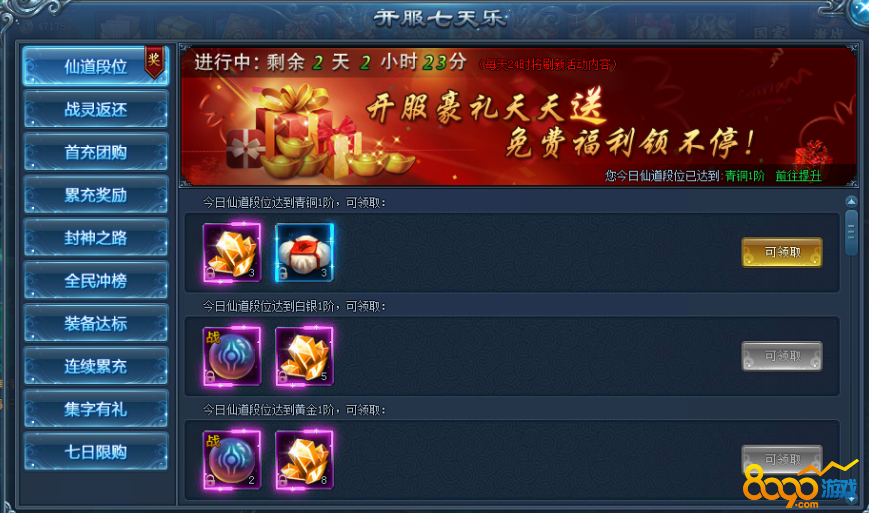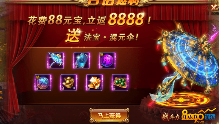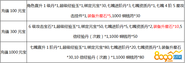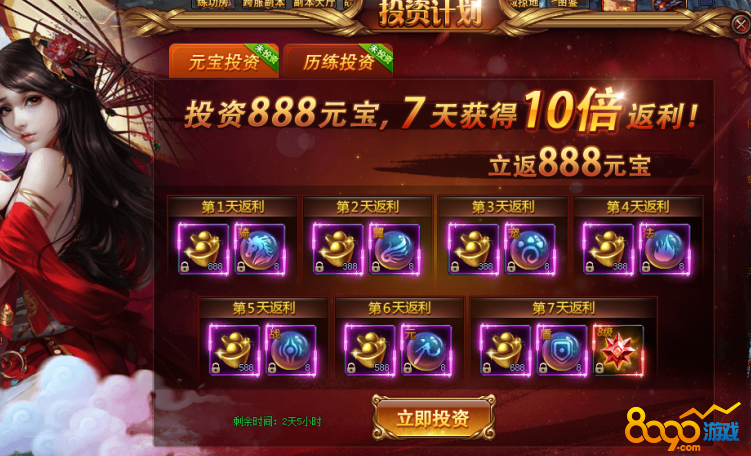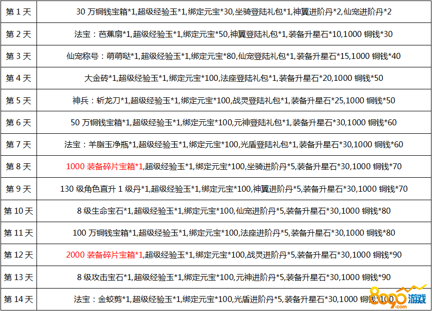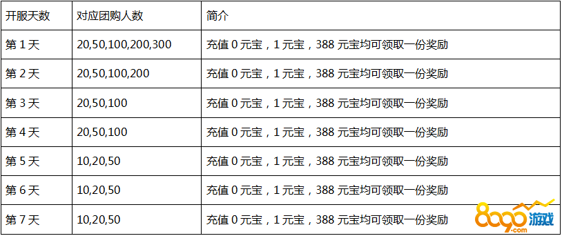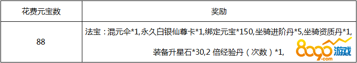 ① 花费888元宝,开服七天每天均可领取一份奖励。