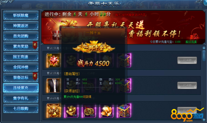 统计累计充值688元宝的天数,达到指定天数,可以领取对应的丰厚奖励。
