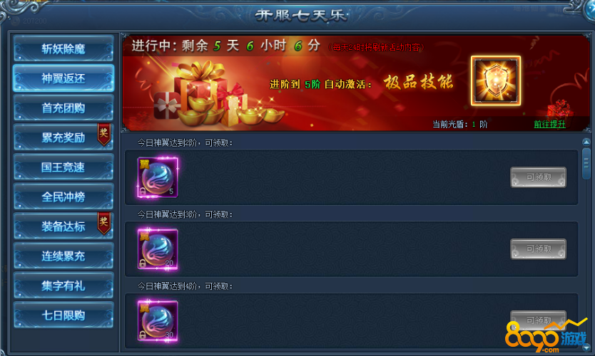 ① 根据开服天数对应不同七魄的进阶目标,达成目标可领取对应奖励。