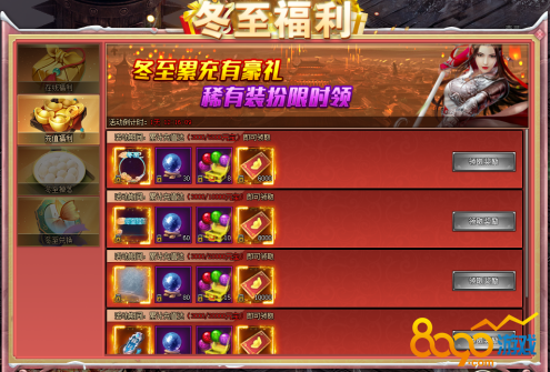 活动二-冬至福利:活动期间累计充值可领取包括冬至限定装扮、称号在内的诸多豪礼