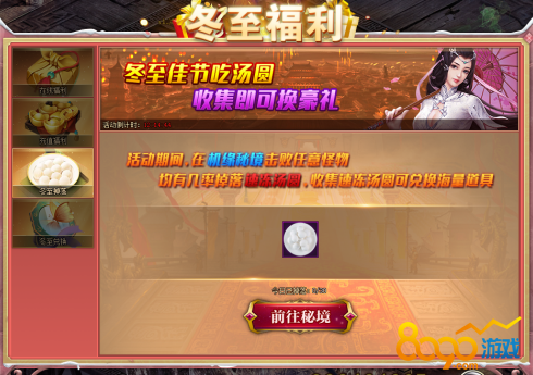 活动三-冬至掉落:活动期间在机缘秘境中击败任意怪物,均有几率掉落道具“速冻汤圆”,收集速冻汤圆可开启获得热气腾腾的汤圆,用于兑换稀有道具奖励