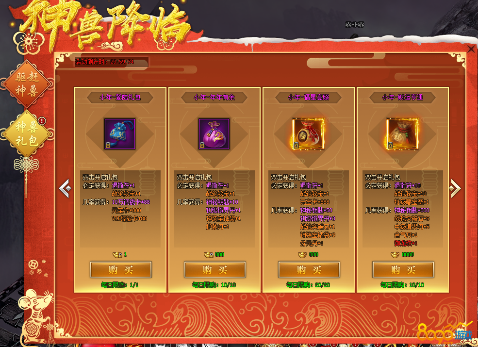 n 活动期间可用极为优惠的价格购买神兽礼包,不仅可开出大量退散符,还有诸多稀有道具奖励