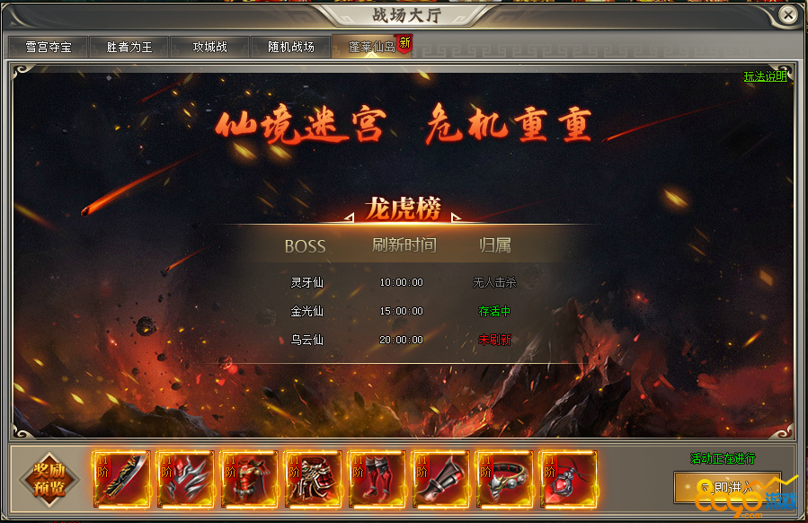 3. 蓬莱BOSS掉落为伤害最高的阵营自由拾取,同时该阵营玩家及最后一击玩家还可额外获得一份奖励,通过邮件发送