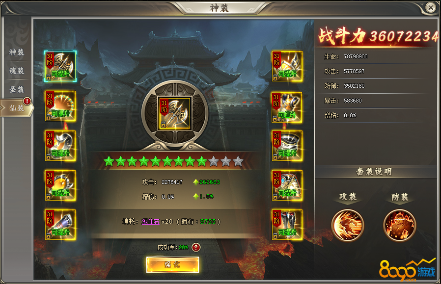 2. 蓬莱仙装可消耗材料升阶,升阶必定成功,越高阶仙装品质越高,可激活的套装属性越好
